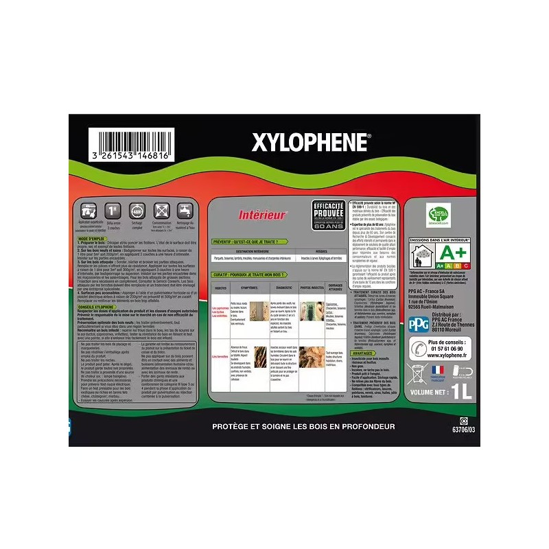Traite et protège efficacement tous les bois intérieurs, quelle que soit leur essence, y compris les bois tanniques (résineux ou feuillus).