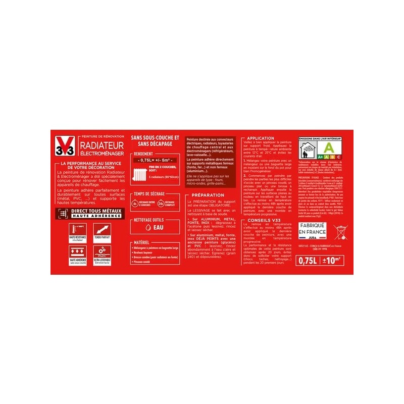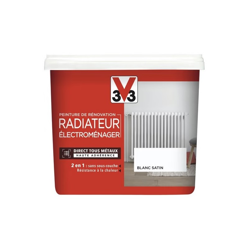 Cette peinture de rénovation, spécialement élaborée pour les radiateurs et les appareils électroménagers, propose une finition blanche satinée élégante. Elle convient parfaitement à une utilisation en intérieur sur des surfaces métalliques, qu’elles soient ferreuses ou non, ainsi que sur des supports déjà peints ou en PVC. Résistante à l’eau, aux chocs et aux taches, elle assure un résultat durable et soigné. Le produit est sec au toucher en 6 heures et totalement sec en 24 heures, permettant une utilisation rapide. Son application est simple, que ce soit au pinceau, au spalter ou au rouleau, et les outils se nettoient facilement à l’eau.