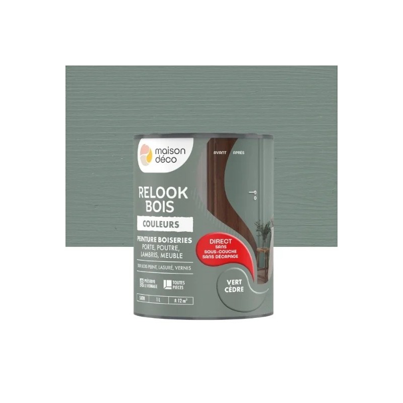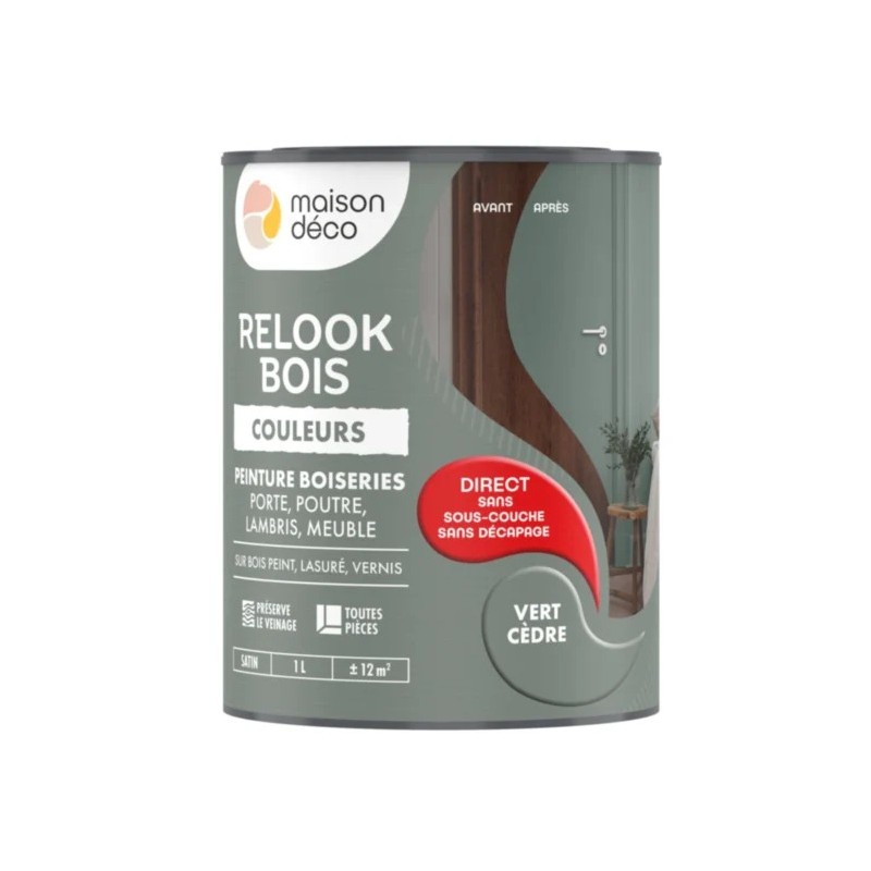 Relook Bois Couleurs est une peinture satinée pour boiseries qui transforme la teinte de votre bois tout en laissant apparaître son veinage naturel. Elle s’applique facilement, sans sous-couche ni décapage, sur bois bruts, déjà peints, lasurés ou vernis. Avec ses teintes inspirées de la nature, elle offre une nouvelle vie à vos portes, poutres, lambris et meubles.