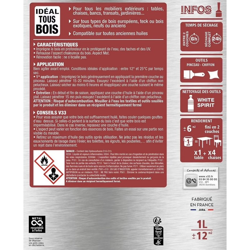 L'huile Mobiliers V33 est idéale pour tous types de bois. Elle nourrit en profondeur les mobiliers neufs ou anciens, en teck ou bois exotiques. Grâce à sa formule à action durable, l'huile protège le mobilier du grisaillement et réhausse l'aspect chaleureux du bois.