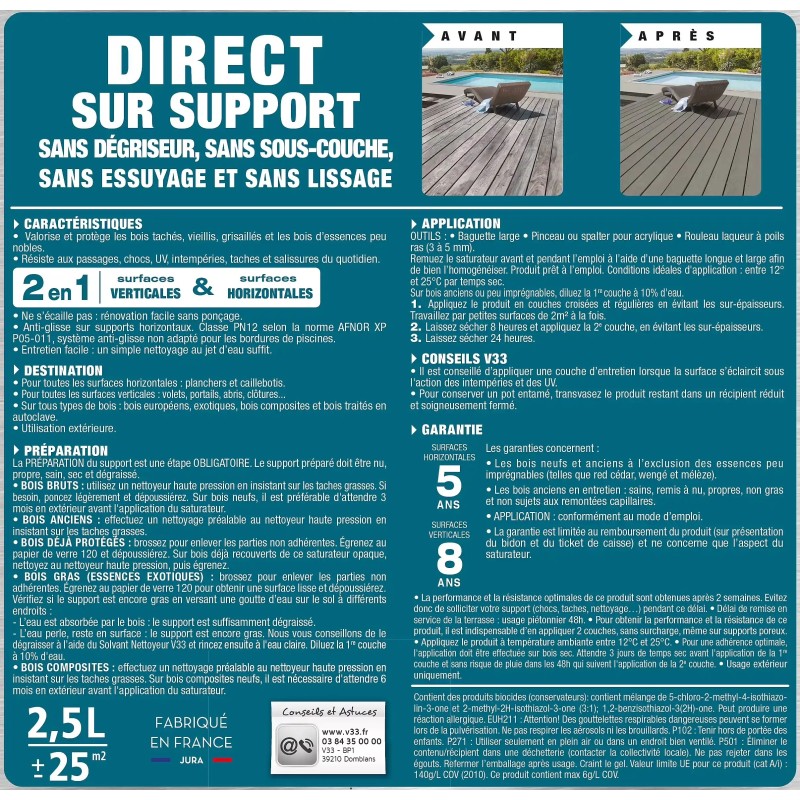 Le Saturateur Terrasses Exterieur V33 s’applique sur tous planchers en bois et caillebotis (teck, bois exotique, pin autoclave...)