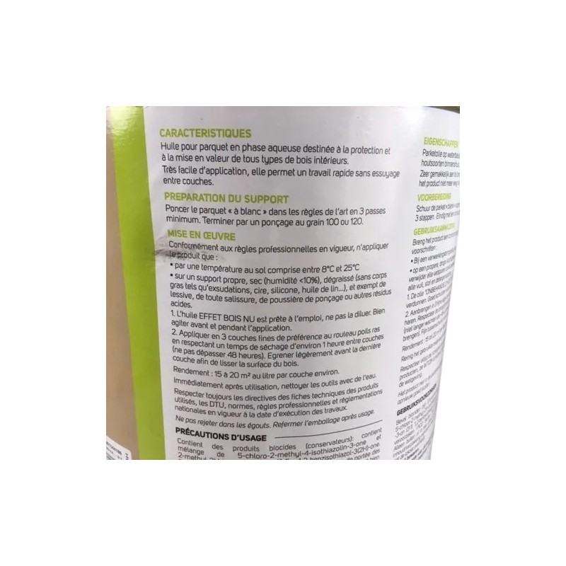 Caractéristiques et destinations : - Huile parquet en phase aqueuse destinée à la protection et à la mise en valeur de tous types de bois intérieurs (boiseries, plinthes...) neufs ou anciens sur toutes essences de bois - Pour les bois difficiles ou rares (exotiques...) consulter notre service technique. - Aspect Effet Bois Nu pour une finition tendance. - Finition huilée qui permet de conserver la beauté naturelle du bois touten le protégeant des taches et de l'usure. Toucher bois. - Facile d'utilisation : 1 seul égrenage entre la 2ème et la 3ème couche. - Seulement 25 g/ L de COV. - 3 couches applicables en une journée.